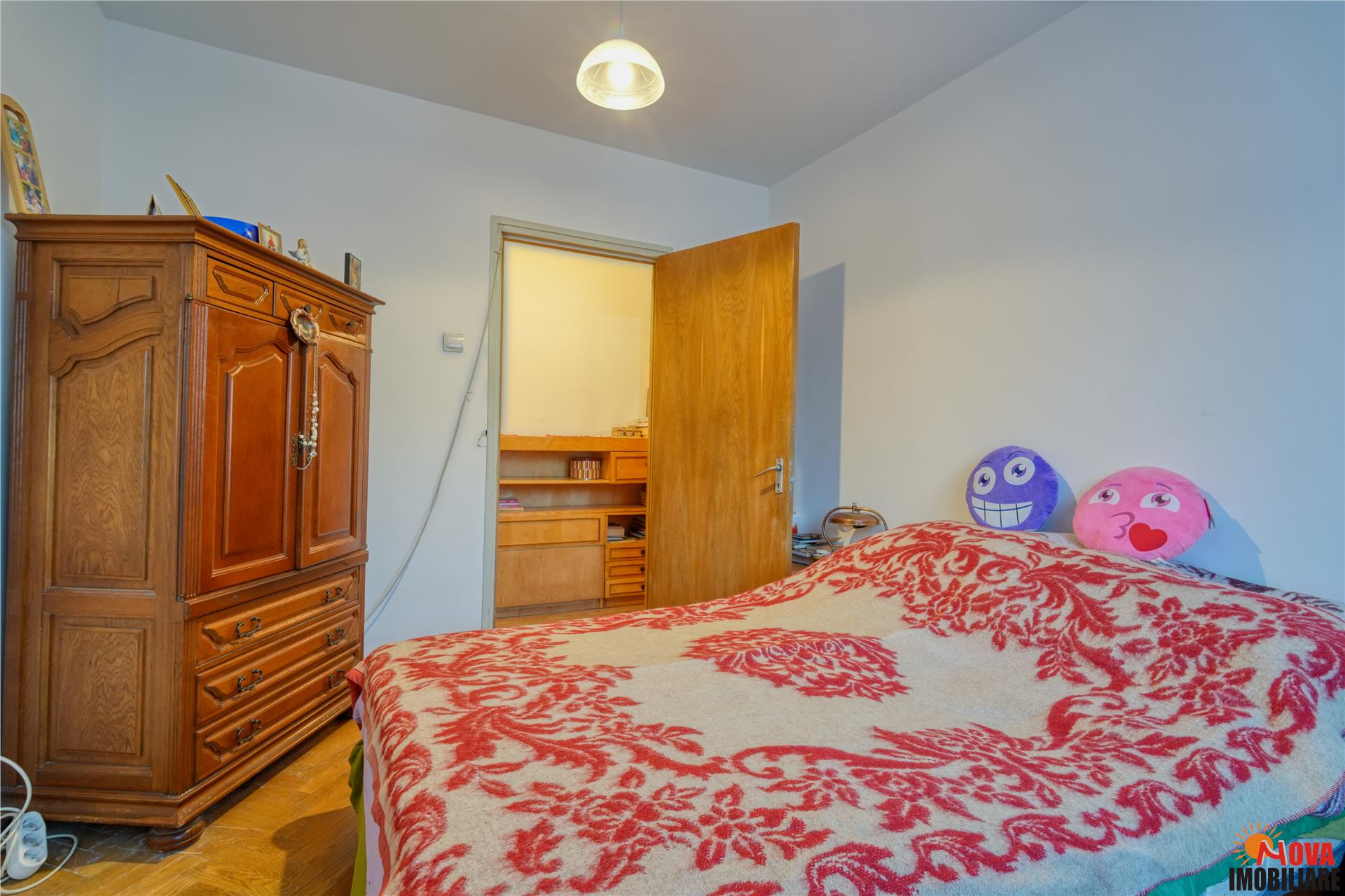 Parchetul din lemn masiv păstrează farmecul clasic al locuinței, iar geamurile termopan și centrala termică proprie asigură confortul necesar.